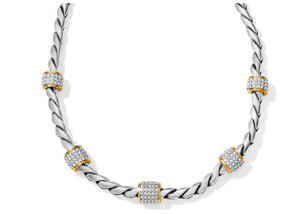 A touch of gold on each barrel station of pave fine quality crystal lends warmth to this fine jewelry-like collection. Wear this necklace and expect compliments. COLOR: SILVER-Gold.