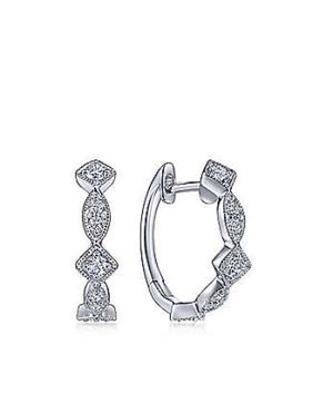 14KT White gold diamond geometric huggie earrings. Light weight on the ear from the Victorian collection, .26ct of diamonds nestled between milgrain. Perfect for everyday wear work or play.