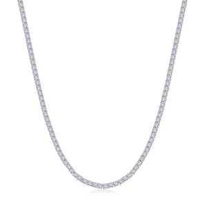 Elegant and sophisticated. This 14.5 CTW tennis necklace is set with Lafonn's signature Lassaire graduated simulated diamonds in sterling silver bonded with platinum. 17 inches. This gorgeous necklace is perfect for black tie, work or play. Tennis anyone??
