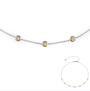 Simple elegance. This adjustable 7 Symbols of Joy choker necklace features seven Lafonn's signature Lassaire simulated diamonds set in sterling silver plated with gold. The chain is in sterling silver bonded with platinum. May the 7 Symbols of Joy bring you Longevity, Health, Love, Happiness, Peace, Prosperity, & Friendship.