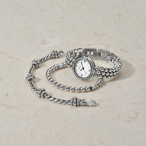 The **Meridian Bracelet** from the Meridian collection features a sleek, silver-plated design with a 7/16" width and a length of 7 1/4". Secured with a fold-over clasp, this elegant bracelet offers a polished and timeless look, perfect for any occasion.