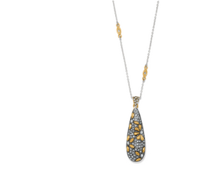 This elegant teardrop necklace from the Garden of Love collection features a beautiful two-tone finish and fine quality crystals. With an adjustable length of 30"-34" and a pendant drop of 2 7/16", this necklace offers versatility and timeless style. A lobster claw closure ensures a secure fit.