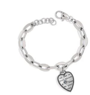 This chunky chain bracelet combines the bet of modern and vintage style with it array of silver-plated and hand-enameled charms, and a heart inscribed with, “Let love be your anchor and hope be your sail.” Two sided heart, one with colored fine quality crystals featuring an Anchor the other side says "Let love be your anchor and hope be your sail."