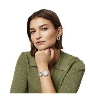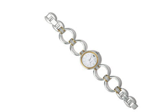 This versatile two-tone watch definitely has the look of a timeless bracelet with links styled after the Meridian Tempo jewelry and a dial decorated with roman numerals and crystals.
