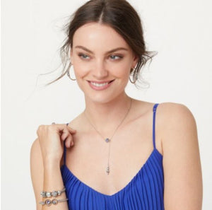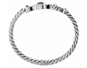 Lavender, blue and aqua fine quality crystals twinkle like stars shown through a telescope, each framed along the rope-edge of this hinged bangle. Its breathtaking design features a hidden magnet close.