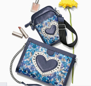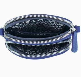 In wonderful shades of blue, highlighted with Italian navy blue leather, this great compact crossbody will match every pair of denim jeans you own, and compliment every other color in your closet.