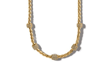 Inspired by the imaginary arc of the earth, this twisted rope curves around the neckline in the same fantastic way, stopping only for admiration of each graduated crystal station.