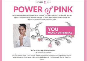 Our 2021 Power of Pink bracelet is designed to be a beacon of inspiration for everyone who is touched by breast cancer. Engraved messages are reminders to have faith, be grateful and live life to the fullest. Hand-set crystals add a pretty touch of sparkle. With your purchase, we will donate $10 to breast cancer charities.