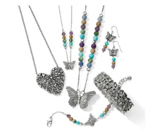 Building upon the exquisitely sculpted Solstice butterfly of seasons past…we have added a splash of color by introducing semiprecious turquoise jasper, picture jasper, tree agate and amethyst stones to the mix.