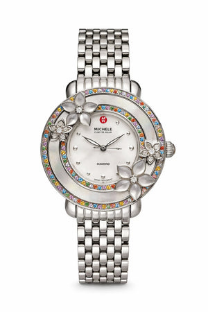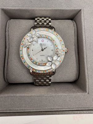 The Michele Cloette Butterfly Limited Edition Diamond Watch features a stunning butterfly dial pattern with multicolor gemstones and a diamond bezel. This women's wristwatch has a quartz movement and water resistance up to 50 meters. The silver band color and 38mm case size add to the elegance of this limited edition timepiece from the brand MICHELE. Complete with original box and packaging, this watch is a luxurious and unique accessory for any occasion. 14 diamonds, 108 gemstones