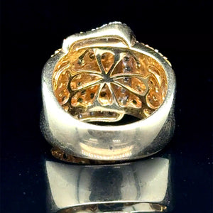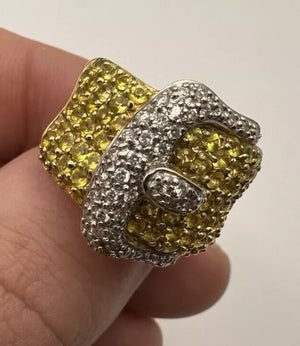 The 14k Yellow Gold Belt Ring with .40cts Yellow Sapphire and 2cts Diamonds is a stunning piece of fine jewelry that features a vibrant yellow color with a touch of luxury. The ring is crafted with 14k yellow gold and set with a beautiful yellow sapphire as the main stone. The secondary stones are sparkling diamonds, adding a touch of elegance to the design. This ring is perfect for anyone looking for a unique and eye-catching piece to add to their jewelry collection.