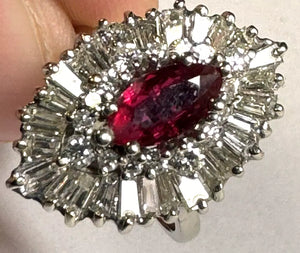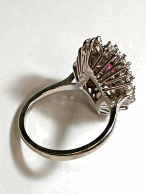 This vintage Estate cocktail ring is a stunning piece of jewelry that will add a touch of glamour to any outfit. Crafted from 14k white gold, the ring features a beautiful baguette-shaped ruby as the main stone, with a secondary diamond and ruby gemstone. The ring is antique and vintage, with a red color scheme and a unique style that is perfect for cocktail parties and special occasions.
