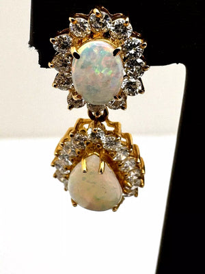 2.5 carats of diamonds. 11 grams total weight. These vintage Estate earrings are a stunning addition to any jewelry collection. Crafted from 14k yellow gold, they feature a beautiful pear-shaped opal as the main stone, surrounded by a diamond halo. The teardrop shape and dangle/drop style make them a perfect choice for any occasion. The earrings are further accented with additional diamonds and an opal secondary stone. They are sure to make a statement and add a touch of elegance to any outfit.