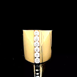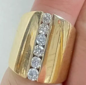 Vintage Estate 14k Yellow Gold Wide Width Diamond Ring .75 ct. 19mm band on longer side, and 10mm on shortest side. 12.7 grams total weight. This stunning gold ring showcases a series of dazzling diamonds set in an elegant linear pattern. The lustrous gold band perfectly complements the brilliant sparkle of each diamond, making it a timeless piece for any jewelry collection. 6 beautiful linear diamonds flowing down the band equal .75 ct.
