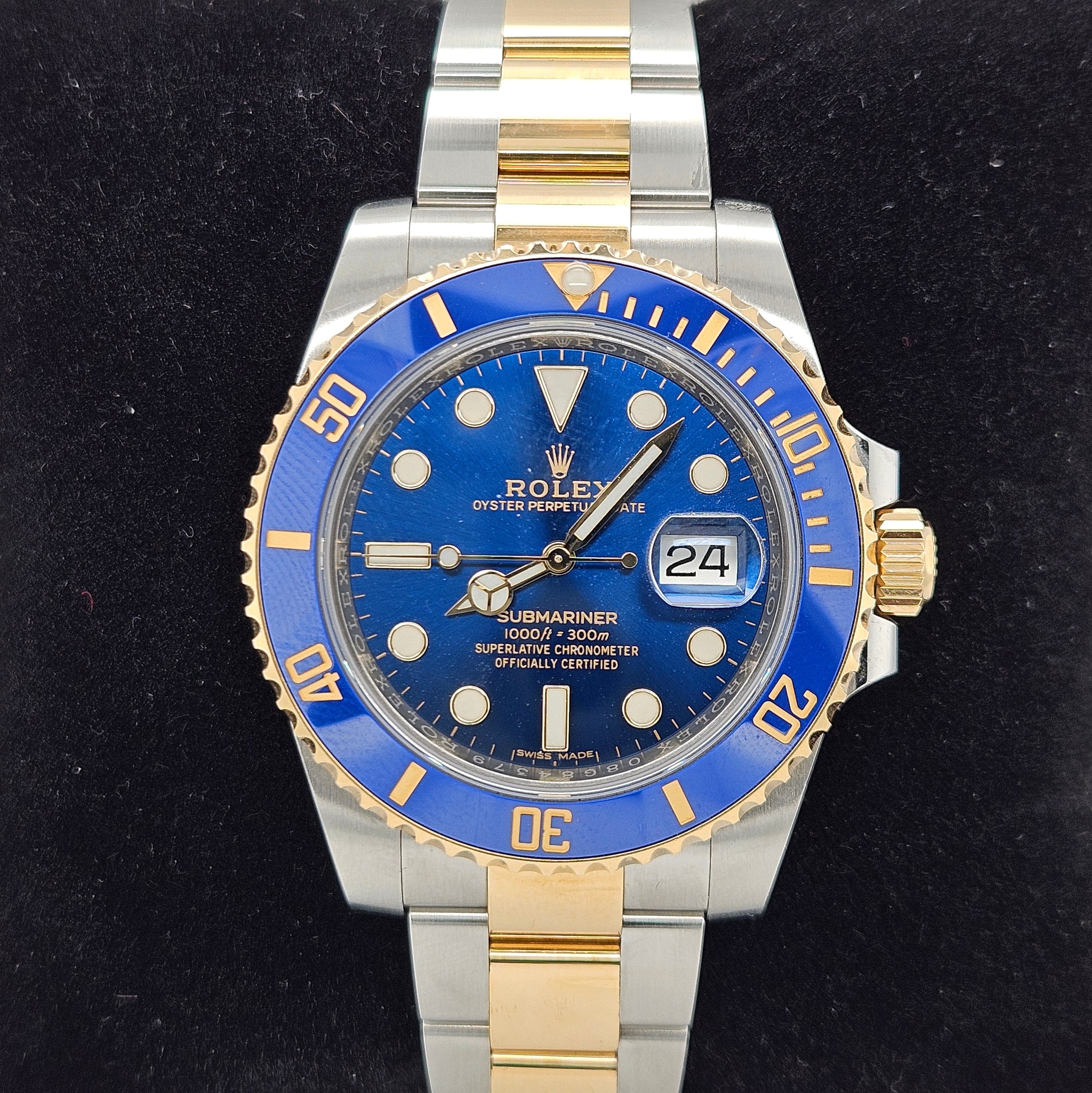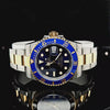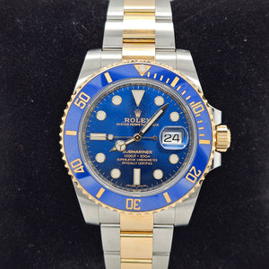 The steel and gold Submariner featuring a blue dial and bezel is often called the "Bluey Rolex." The Rolex blue face is decorated with gold-trimmed Tritium hour markers and hands, mirroring the sophisticated blue and gold bezel. The steel and gold case and bracelet tie the entire look together, giving this Rolex 16613 a deluxe aesthetic that is nautical to its core. Outwardly, this striking Sub is remarkable. However, it's also a reliable diver's tool watch at heart, boasting water resistance up to 1,000 feet, a chronometer-rated self-winding movement, and a uni-directional time-lapse bezel. This Rolex is from August 2018 , B