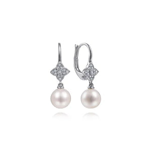 14K White Gold Floral Diamond Pearl Drop Earrings