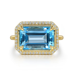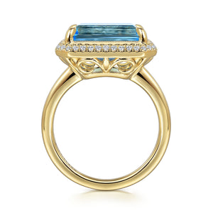 Whether you're celebrating a milestone or treating yourself to a luxurious gift, this statement ring is designed to captivate. The bold contrast of the emerald-cut blue topaz against the warm tones of yellow gold and the shimmer of diamonds creates a unique and memorable aesthetic.