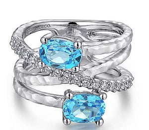 Vivid color and dynamic texture define this compelling wide band fashion ring. Multiple strands of hammered 925 sterling silver are adorned with a pair of oval shaped blue topaz stones as well as a ribbon of dainty pavé white sapphires. Make a stylish statement with this singular ring.