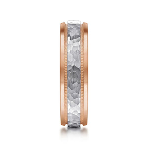 14K White-Rose Gold 6mm - Two Tone Hammered Men's Wedding Band with Milgrain Edge