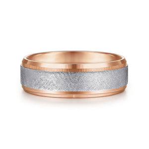 14K White-Rose Gold 7mm - Beveled Edge Men's Wedding Band in Horizontal Brush Finish