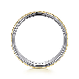 Discover timeless elegance with this 14K White and Yellow Gold Men's Wedding Band. Measuring 7mm in width, this striking ring features a distinctive rope center, meticulously crafted to add texture and sophistication. The polished edges beautifully frame the intricate rope design, enhancing the ring’s overall shine. The high-polish finish amplifies the blend of warm yellow gold and cool white gold, making it a perfect choice for the modern groom who appreciates classic luxury with a contemporary twist. This wedding band stands as a symbol of enduring commitment and refined style.