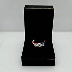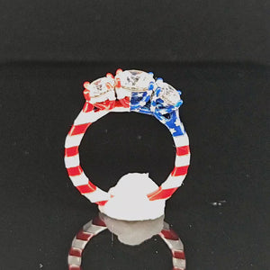Introducing the pinnacle of luxury and patriotism: the Ladies' 14K Gold Enamel American Flag Ring adorned with three exquisite diamond stones, meticulously crafted in the USA. This ring is a testament to refined taste and unwavering pride. The radiant 14K gold band serves as a stunning canvas for the iconic stars and stripes of the American flag, meticulously enameled to perfection. At its heart shines a breathtaking 2ct lab-created diamond of F color and VVS2 clarity, symbolizing the brilliance and resilience of the nation. Flanking this magnificent center stone are two dazzling .50ct diamonds on each side, adding a touch of sparkle and symmetry. Each facet of this ring reflects the superior craftsmanship and enduring spirit of America. Whether worn as a statement piece or cherished heirloom, this ring captures the essence of American heritage with unparalleled elegance and grace. Call to have ring made up in your size 516-650-6709