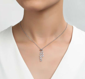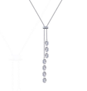 Chic and modern. This exquisite adjustable lariat Y-necklace features three round frameless simulated diamonds at one end of the chain and four frameless simulated diamonds at the other end. These Lassaire simulated diamonds are connected by 14-karat gold components. The necklace is in sterling silver bonded with platinum. CTW: 3.22