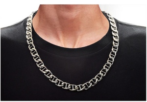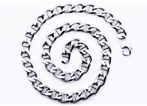 The 24" mariner link chain is a refined and elegant piece of jewelry, perfect for enhancing any look with a touch of sophistication. Featuring classic mariner links, this chain is characterized by its symmetrical, oval-shaped links with a distinctive bar through the center, reminiscent of nautical chains. Made from high-quality metal, it boasts a smooth, polished finish that catches the light beautifully. The 24-inch length offers a comfortable fit, draping stylishly around the neck. Versatile and timeless, this mariner link chain is an excellent addition to both casual and formal attire, embodying both strength and elegance.
