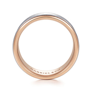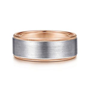 14K White-Rose Gold 8mm - Two Tone Beveled Edge Men's Wedding Band in Satin Finish